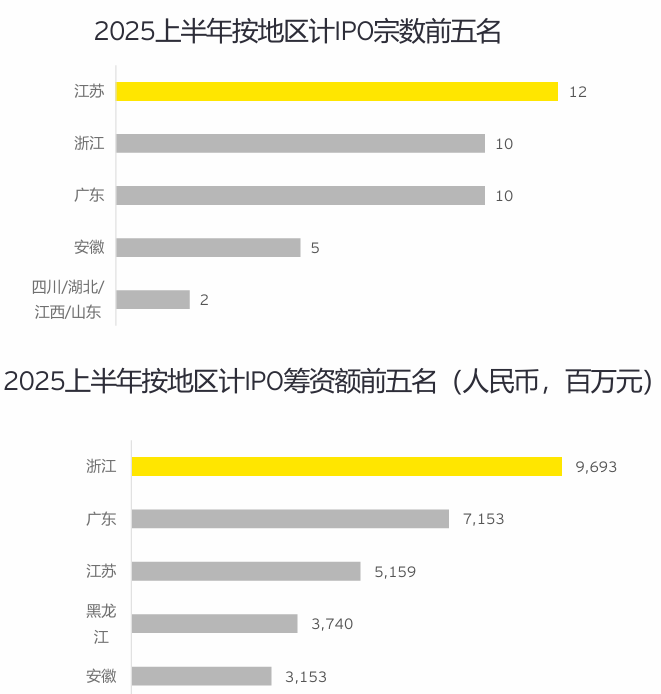安永指出,浙江、广东、江苏、黑龙江和安徽的2025年上半年IPO融资额,占总融资额的78%。