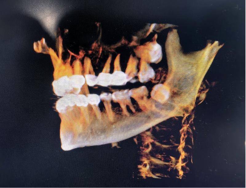 术前:尖牙横行贯穿埋伏于左上颌骨内,牙冠位于上腭,牙根位于鼻根侧下方。