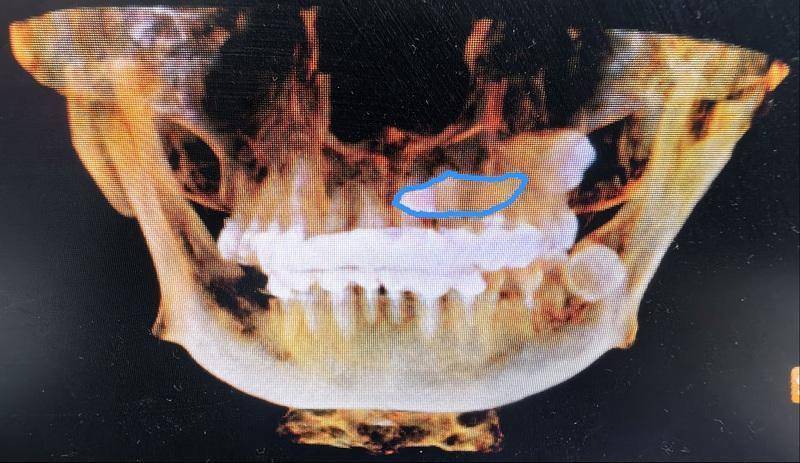刘弦医生仔细查看口腔锥形束CT影像,发现这颗左上颌埋伏尖牙堪称“定时炸弹”——硕大的牙根死死压迫邻牙,稍有拖延便会连累邻牙不保。更棘手的是,这颗牙前临鼻腔、后靠上颌窦,周围缠绕着鼻腭神经血管束,拔除时稍有偏差,牙体就可能坠入鼻腔或上颌窦;面对谢女士“希望门诊局麻下拔牙”的请求,这个手术难度堪比在精密仪器上“穿针引线”。